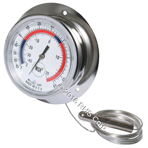 3-1/2" DIAL, REAR MOUNTED THERMOMETER. CASE: S/S WITH CLEAR PLASTIC SNAP-IN LENS. TEMP RANGE: -40 TO +60 F (-40 TO +15 C) DUAL SCALE. 9 FOOT CAPPILARY.
