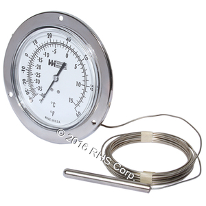 4-1/2" DAIL THERMOMETER, FLUSH MOUNTED THERMOMETER. S/S CASE WITH GLASS LENS TEMP RANGE: -40 TO +60 F (-40 TO +15 C), DUAL SCALE. 20 FOOT CAPILLARY.