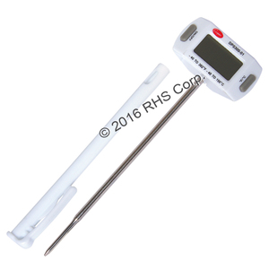 DIGITAL POCKET TEST DIGITAL THERMOMETER. .25" LCD DISPLAY, -40 TO +302 F. 5" STAINLESS STEEL STEM. COMPLETE WITH SHEATH & CLIP, 1.5 VOLT BATTERY. SWIVAL HEAD, AUTO TURNS AT 30/60/90 DEGREES.